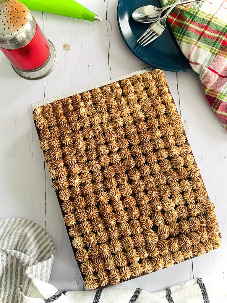 - Slice, serve and enjoy! This sheet cake is best enjoyed straight away