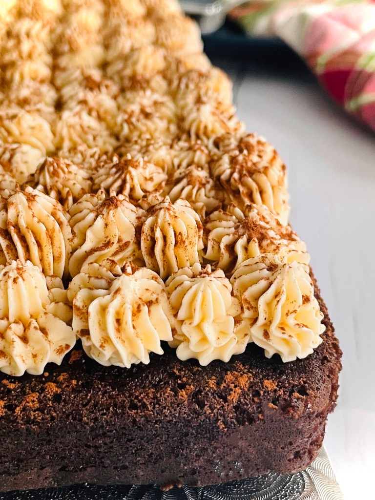 - Spoon the aquafaba meringue over the ganache layer and spread to cover the surface. Use a fork or the back of a spoon to create ruffles/ peaks