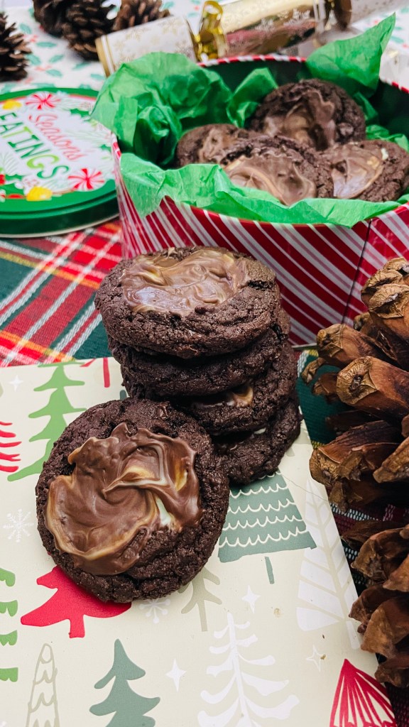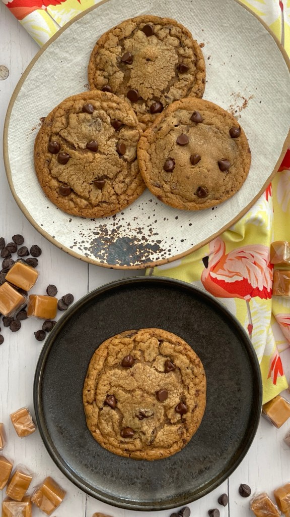 11. Bake at 325°F for 18-20minutes. The cookies will spread slightly spread and be domed where the caramel candy is. Remove the cookies from the oven and let cool on their baking sheets for 5 minutes. Stud with additional chocolate chips if wanted. After that, transfer the cookies to a rack to cool completely*