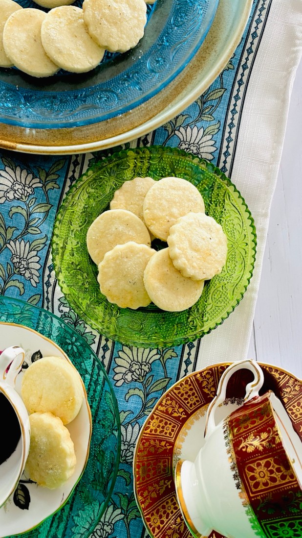 3. Roll out the dough on a lightly floured surface to 1/4 inch thickness. Cut out the cookies using your preferred cookie cutter. I used 1 1/2 inch fluted and plain circular cutters for bite-size cookies. Carefully transfer the cookies to a parchment-lined baking sheet using a spatula.