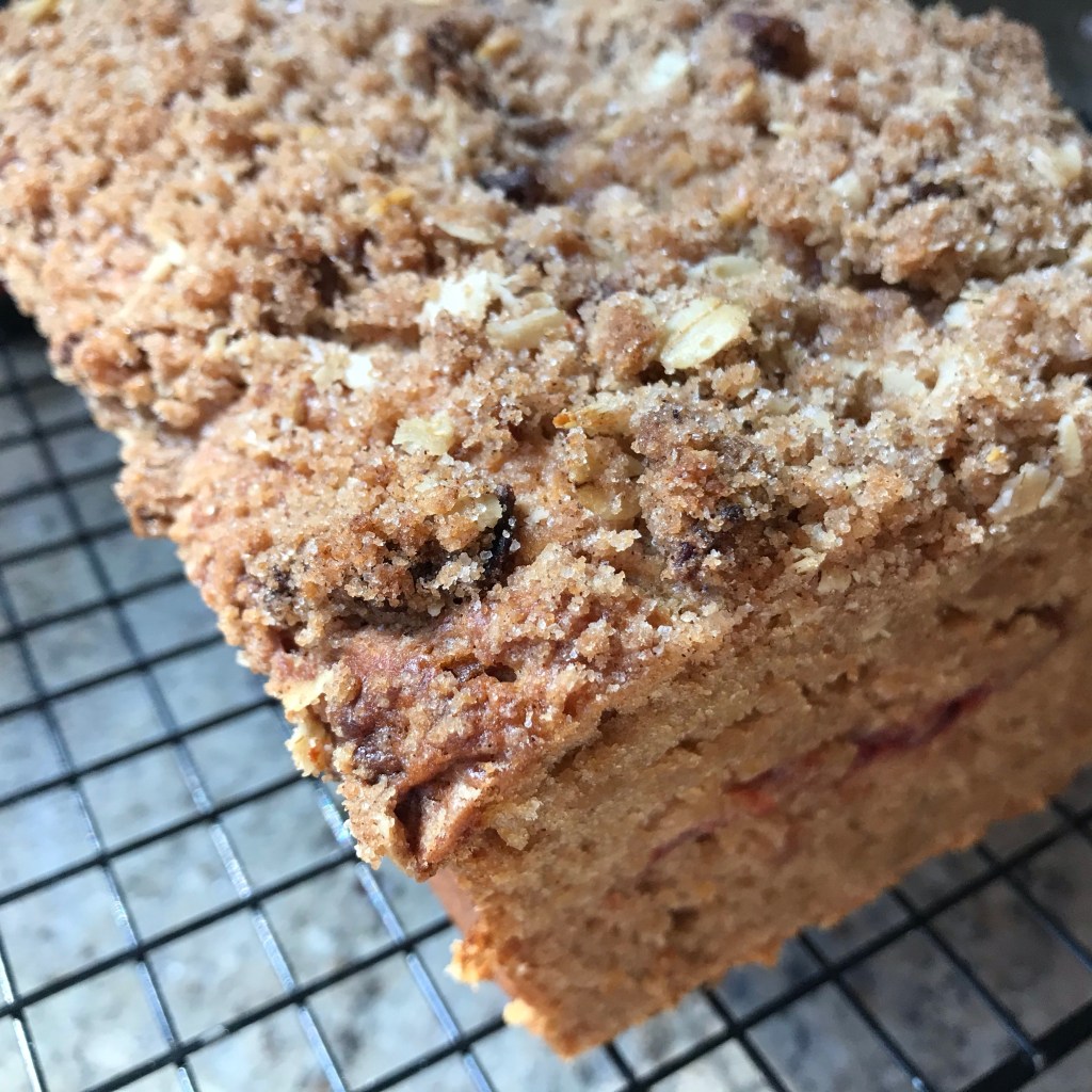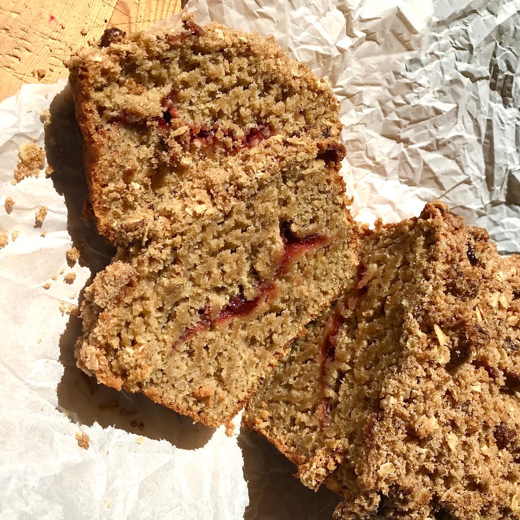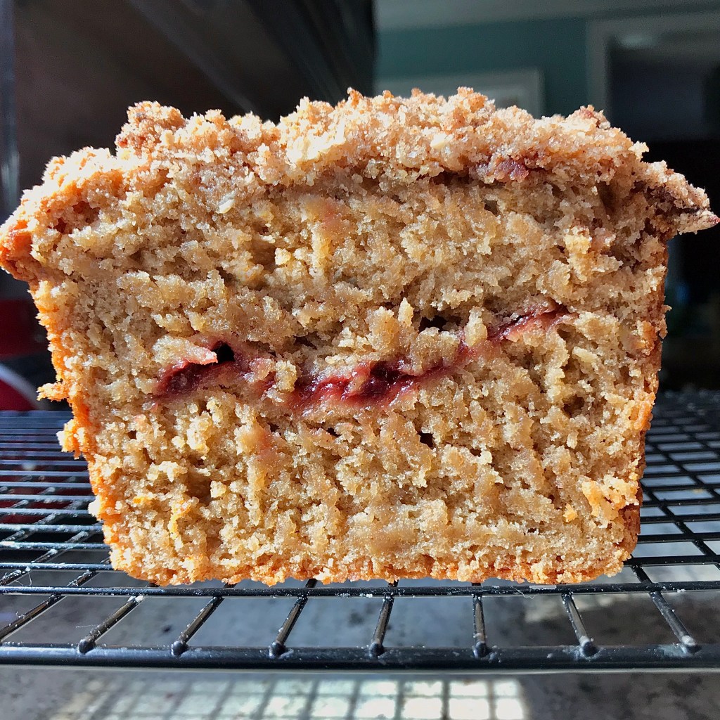 Pour 1 /2 of the batter into the loaf pan. Using a piping bag or spoon, place dollops of the jelly along the top of the loaf batter leavings about 1 inch border around. Once you’ve got the jelly piped in how you’d like, pour the remaining loaf batter over to cover the jelly and roughly level the top. Generously sprinkle over the streusel topping to an amount of your liking