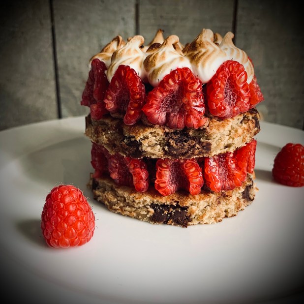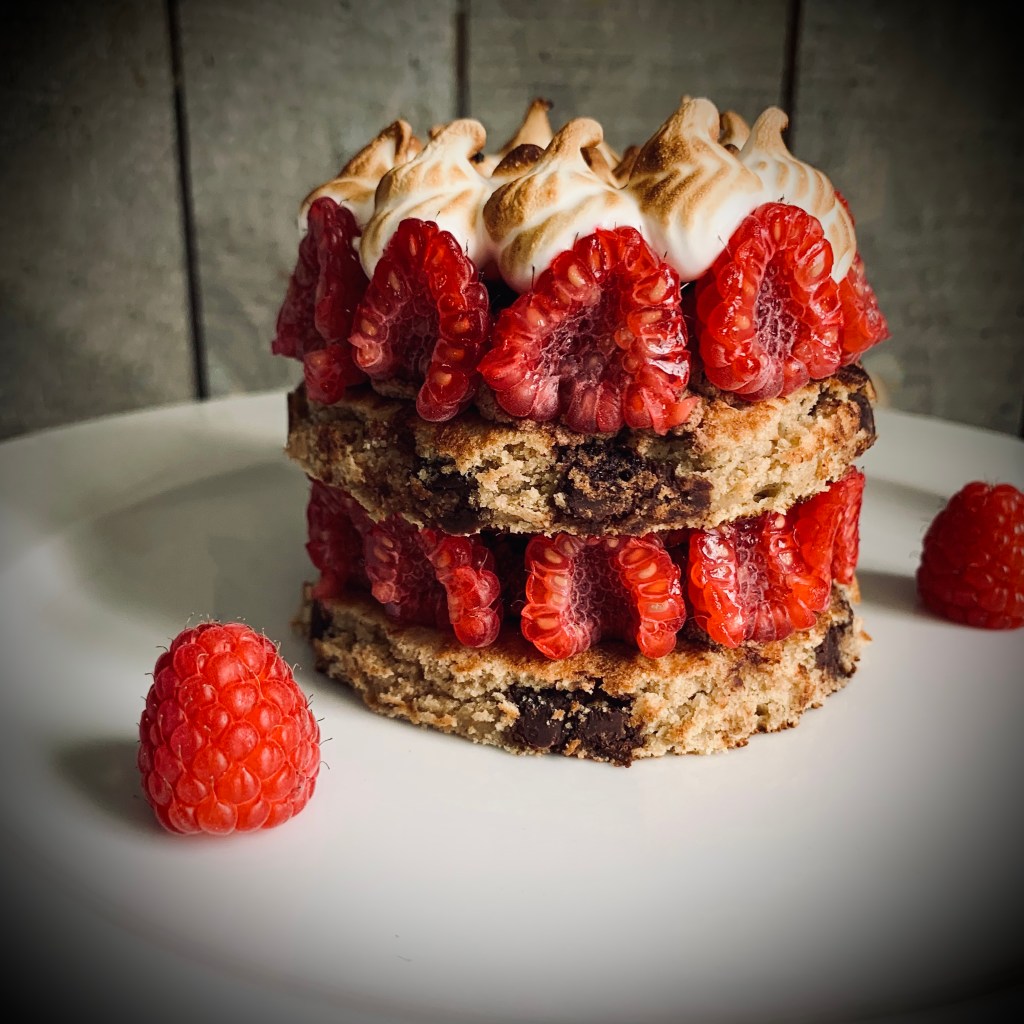 Of course trying to marry such a quintessentially classic comfort pudding with the concept of brunch was always going to be a fun challenge at best! In my head the signature layers of the original recipe lend themselves perfectly to create a layered, stacked brunch dessert. Here I’ve created a pancake stack bordering on an entremet- layers of pancake with ganache, custard, and jelly regally crowned with peaks of soft, fluffy meringue. Anyone for a boujee brunch?