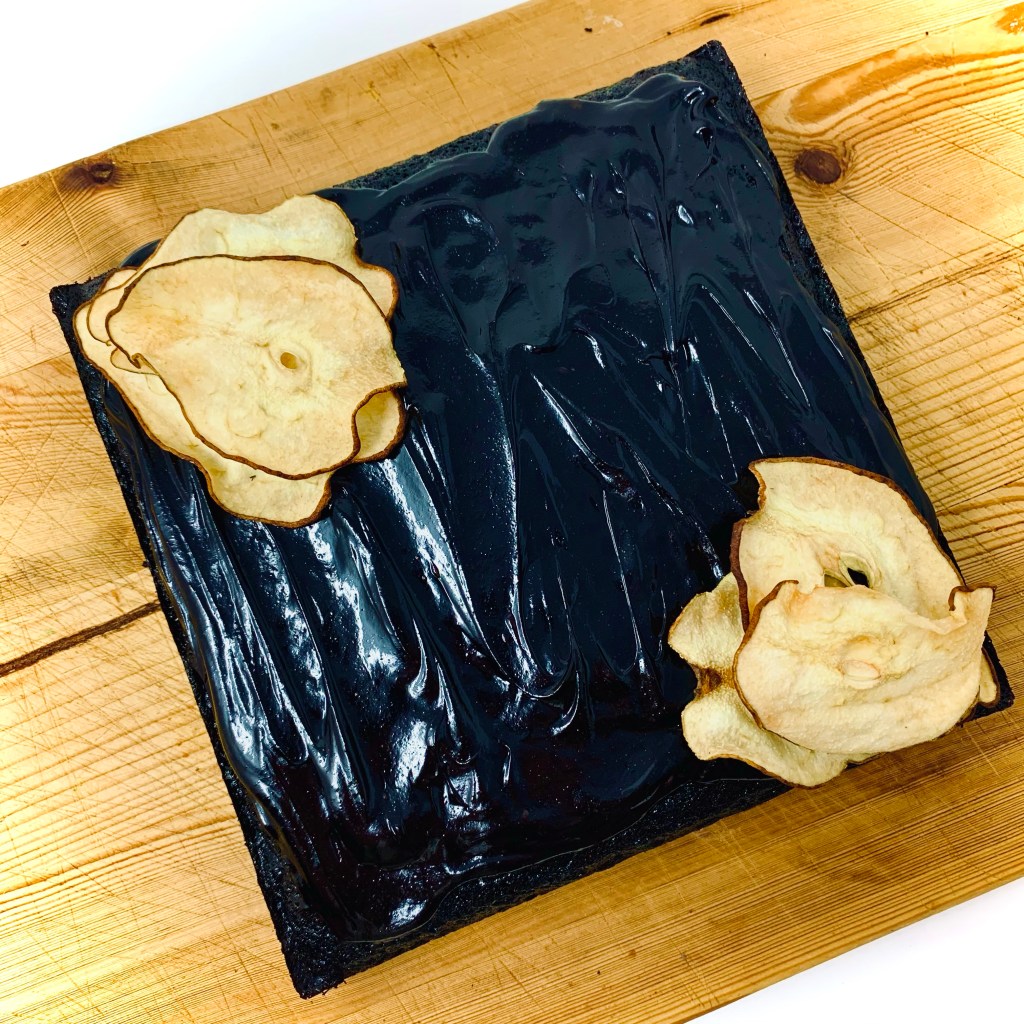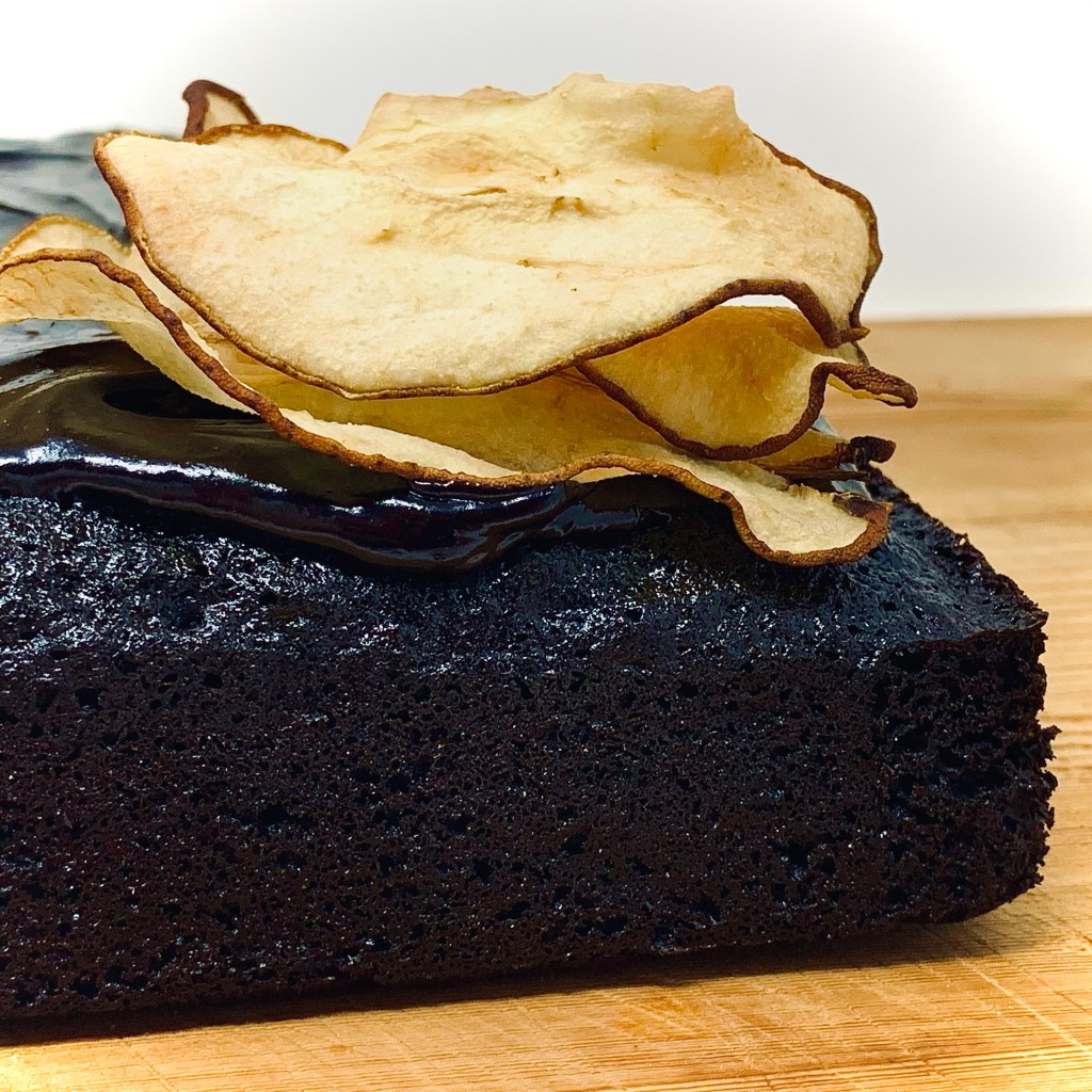8. Once completely cool spread the babka spread over the top as you would a ganache. Decorate as you like. Here I’ve used some dehydrated pear slices (for no other reason than I was playing with a new piece of kitchen equipment!)