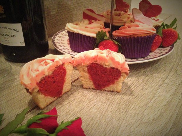 - Pour finished batter into cupcake cases to quarter the full level, stand heart shapes in batter and, while holding them upright, steadily pour additional batter around until cases are two-thirds full. The batter should now be surrounding the hearts and keeping them upright.