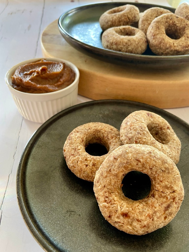 4. Using your hands, roll each part into a ball and then use your thumbs to make a hole in the centre of each ball. Continuously use your hands to smooth together the dough as you dig a hole in the centre to make a donut shape