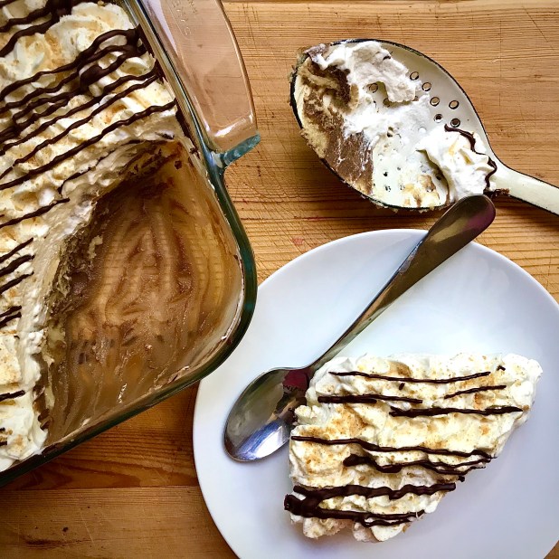 When cooled, spread about 1 cup of the chocolate pastry cream into an 11 by 11-inch glass dish. Layer the wafers, bananas, and pastry cream in the bowl, ending a layer of wafers. Cover tightly and refrigerate until chilled, at least 4 hours or overnight