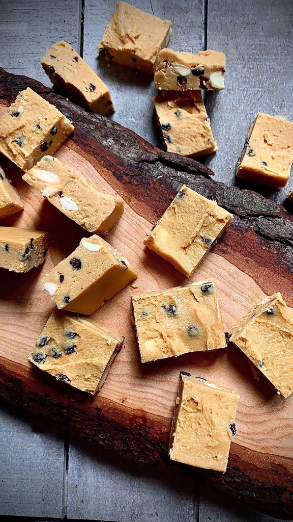 Think of this as a pimped up Fruit & Nut bar. For me the recipe brings to mind a stroll through the woods and spying all the wild bounty. In fact, if I were anyone else, a foraging trip. Crunchy toasted almonds give a wonderful textural contrast to the smooth, creamy fudge studded with blueberry flavor. Being dried their flavor is that little bit more concentrated and works really well to provide pops of berry to counter the fudge becoming too cloying. As for the maple syrup? Well, IMO everything tastes better with maple syrup!