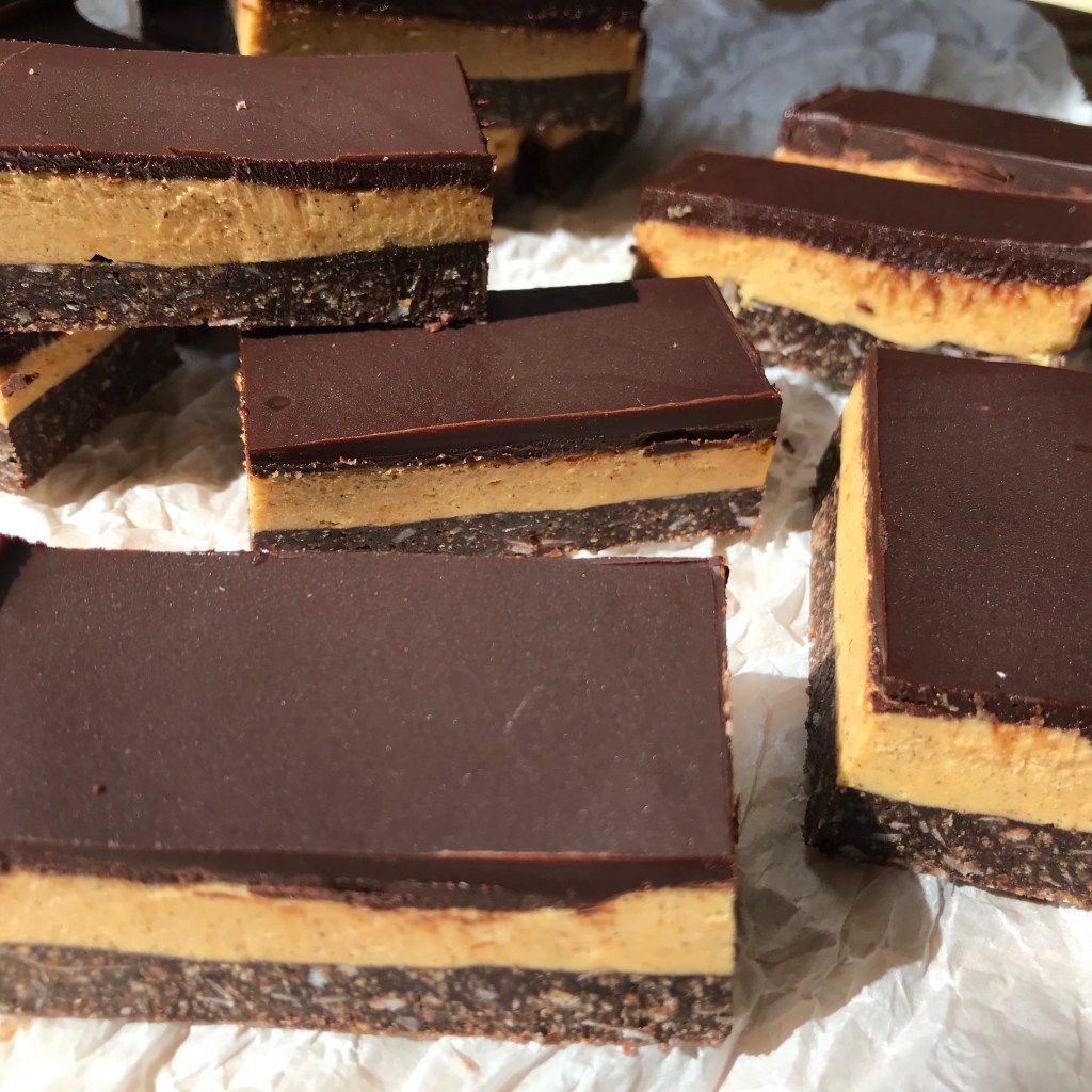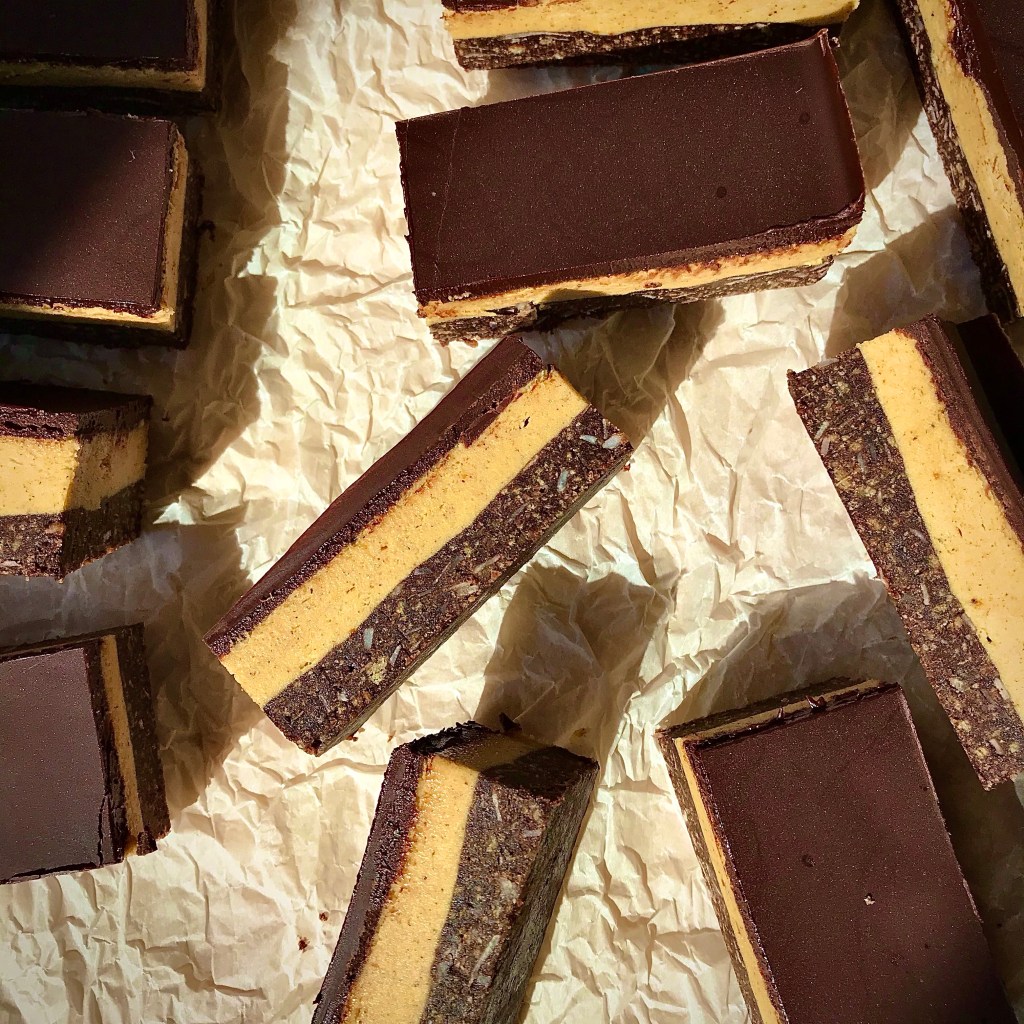 You may be thinking I’m lining up for an utterly dismissive and scathing post on pumpkin affairs, but let me say no. I’ve become as much a fan of warmly spice fall bakes as Becky (albeit with less of a penchant for chunky knit cardigans). So here we are at this recipe- my love for the Canuck stalwart that is the Nanaimo Bar embracing the gentle spiced earthiness of pumpkin. The first attempt at this recipe had me overshooting the mark on the addition of the pumpkin puree. The filing layer wasn’t so much the familiar creamy spreadable mixture as it was pourable, in fact pretty much bordering on soup. So- it was back to the recipe board with that one! After some tweaking a more workable result was achieved- creamy, orange-tinted and subtly spiced.