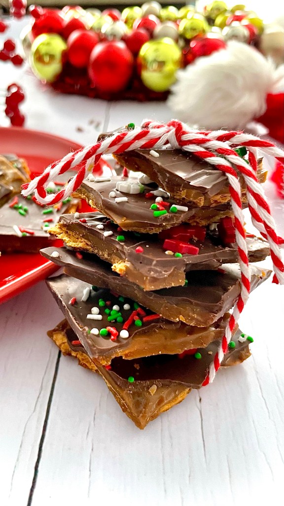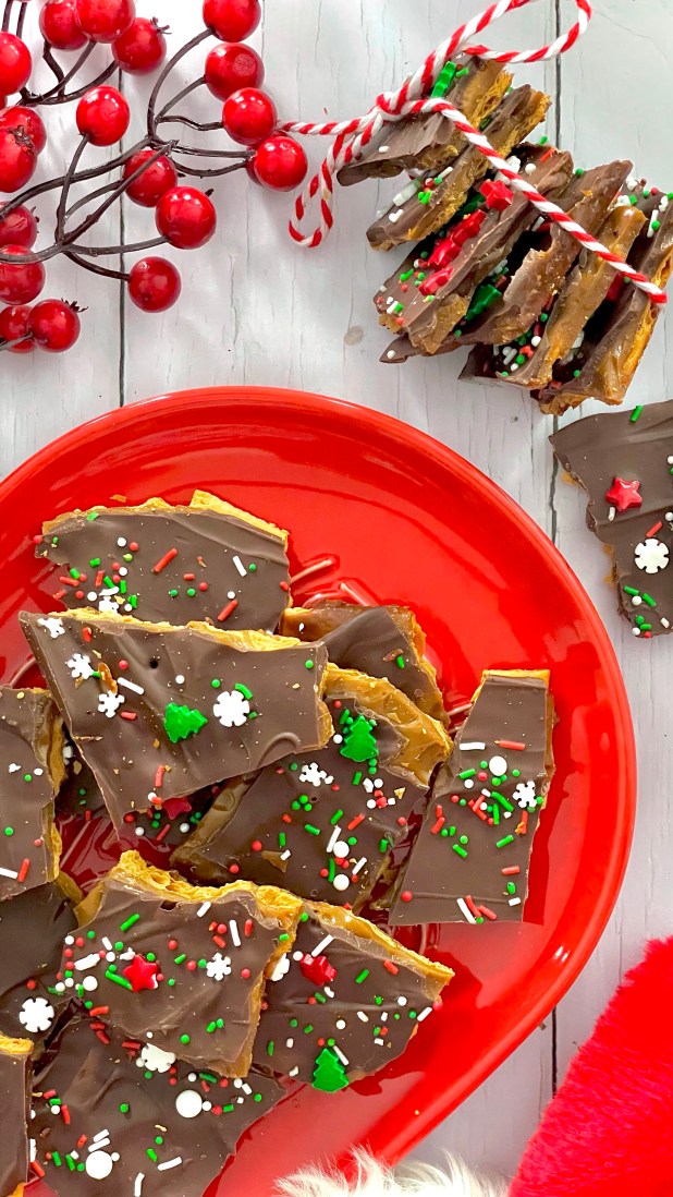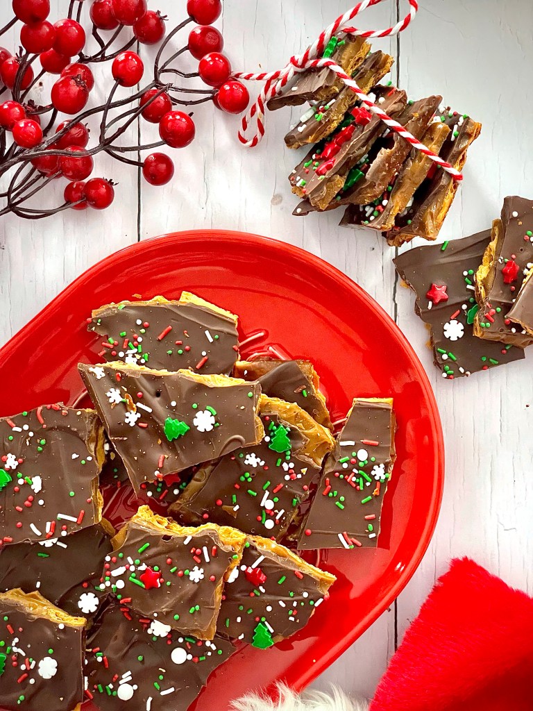 - Remove the pan from the heat and carefully pour the caramel mixture over the crackers. Using a silicone spatula or palette knife spread the mixture to cover the surface of the crackers