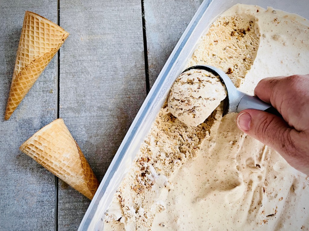 To serve, remove the ice cream from the freezer 5-10 minutes before serving so that it is scoopable