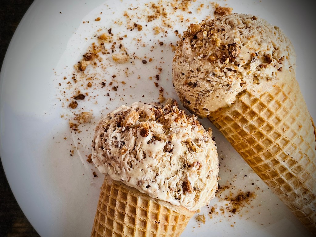 Salted caramel swirl ice cream is one of my favorites- both taste and visuals are satiated tracing the sweet rivulets through sweet creamy mounds. So why not include that here. I use peanut butter as a base for the caramel swirl in order to tie all my reference points together – paying homage to bygone favorites with a nod to my own personal ones. And hey, it’s Summer! Who doesn’t like ice cream?