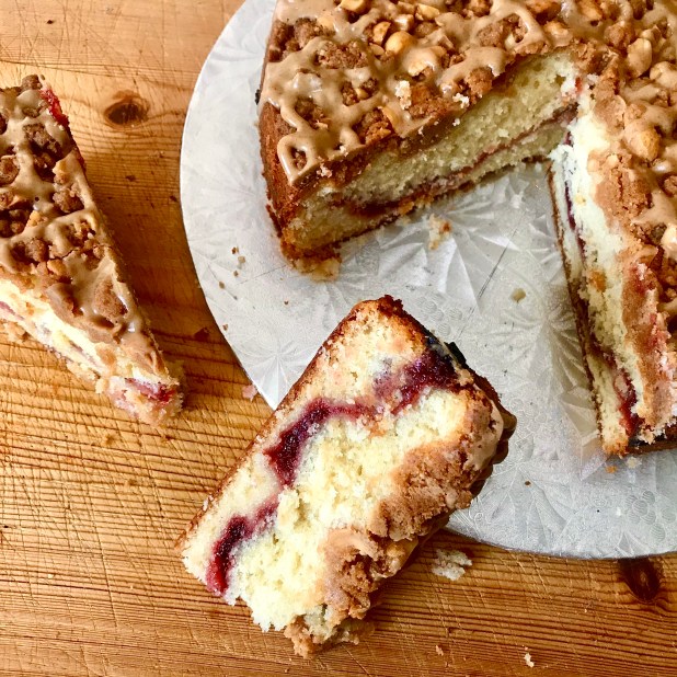 - Pour 1 /2 of the batter into the loaf pan. Using a piping bag or spoon, place dollops of the jelly along the top of the loaf batter leavings about 1 inch border around. Once you’ve got the jelly piped in how you’d like, pour the remaining loaf batter over to cover the jelly and roughly level the top. Generously sprinkle over the streusel topping to an amount of your liking