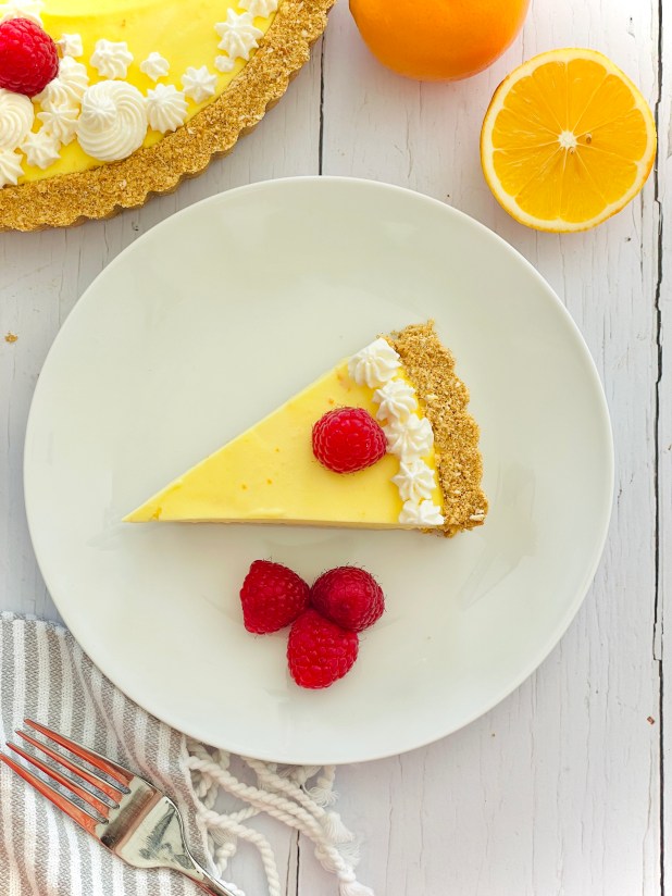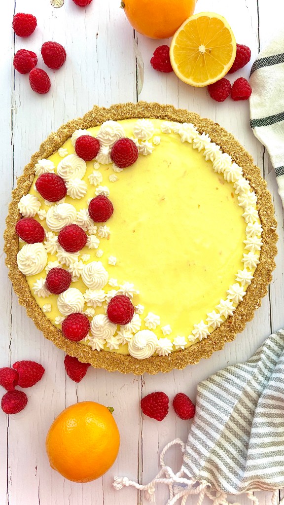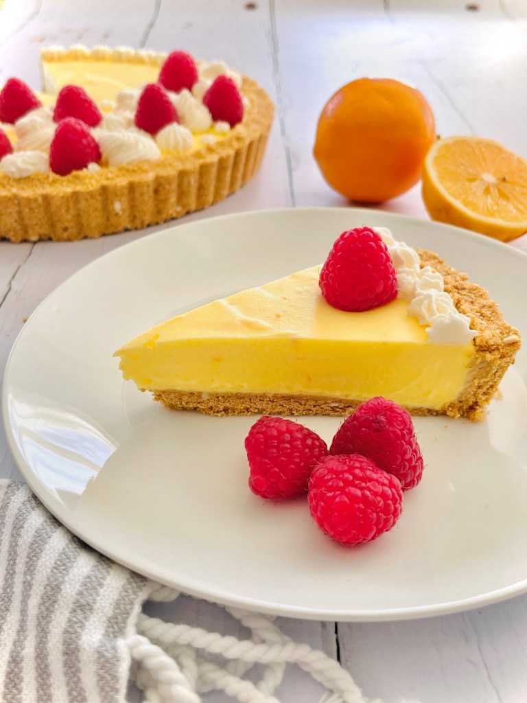 - Pipe/ decorate the top of the set pie to your preference and finish with fresh raspberries