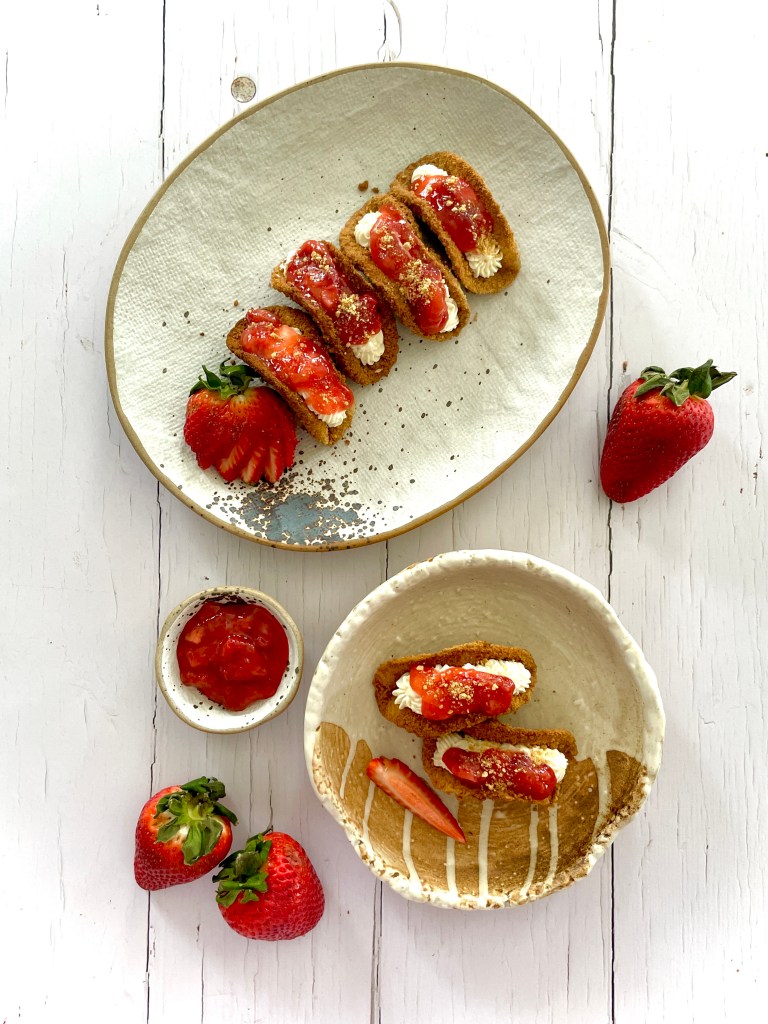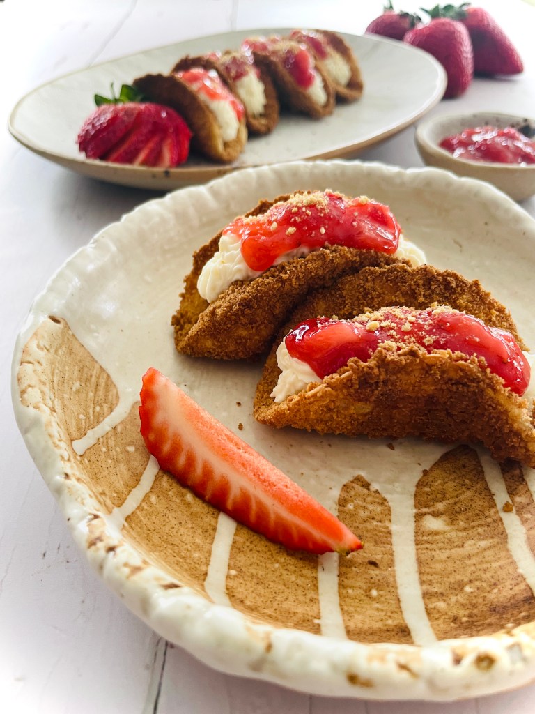 - Fill the taco shells with cream cheese filling and top with 1/2 tsp strawberry filling. Sprinkle with additional graham cracker crumbs. Any remaining strawberry sauce can be used for dipping