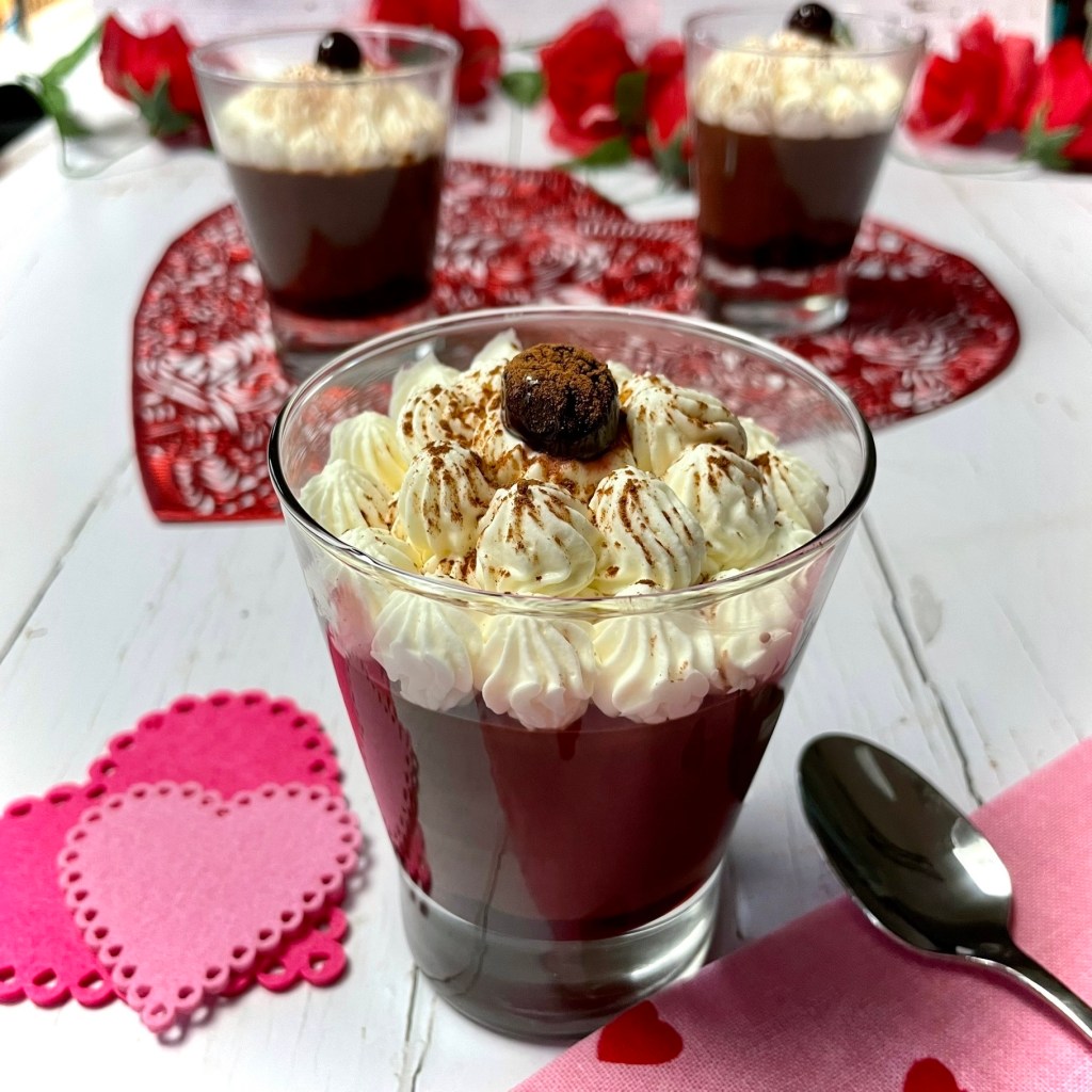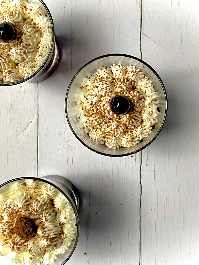 Pipe or spread the vanilla cream over the tops of your set chocolate, dust with cocoa powder, top with an Amarena cherry (optional). Serve and enjoy